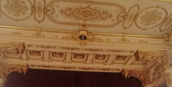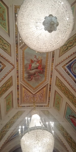 Rimaniamo nella Sala del Ridotto e alziamo la testa per ammirarne il soffitto: a guardarci dall'alto l'affresco di Armonia ovvero quello che dovrebbe essere il volto della Duchessa Maria Luigia. E questa non è la più evidente omaggio a questa importantissima figura della storia della città di Parma, sopravvissuta al restyling Borbone: uno dei tesori del Teatro Regio è il suo splendido sipario.