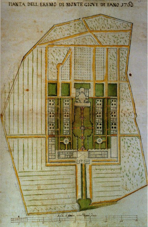La struttura architettonica dell’Eremo di Monte Giove riflette il modello dell’Eremo di Camaldoli al quale tutti gli eremi costruiti dai Monaci Coronesi richiedevano edifici sobri e funzionali. Si raggiunge l’ingresso salendo un breve viale al cui termine si entra nell’ampio androne, si evidenzia il luminoso percorso centrale che conduce alla chiesa settecentesca. Accanto all’ingresso si trovano l’Antica Farmacia e l’accesso alla terrazza panoramica. All’inizio del viale, sul lato destro c'è la foresteria e sala convegni, mentre a sinistra il refettorio, la biblioteca e la cucina. Ai lati del viale si trovano le celle dei monaci, tre sul lato destro e sei su quello sinistro. Ogni cella è strutturata in modo da consentire al monaco di avere lo spazio necessario per la preghiera, lo studio, il riposo, e un piccolo giardino.