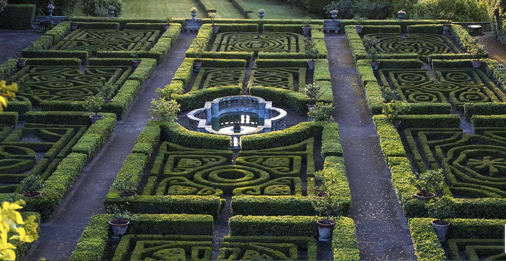 L'area di Viterbo ha la più alta concentrazione di giardini storici al mondo. Qui il giardino all'italiana ha raggiunto la sua massima espressione e Vignanello rappresenta forse l'esempio più elegante, sofisticato e celebrato al mondo. Il giardino adiacente ospita uno dei parterre più acclamati del XVII secolo; l'ampio spazio, piatto e rettangolare, è attraversato in lunghezza e larghezza da quattro vialetti da giardino, che definiscono dodici parterre di bosso allineati e squadrati che racchiudono al centro una grande vasca, chiusa da quattro archi di balaustre. Queste "sculture vegetali", originariamente realizzate con salvia e rosmarino, conferiscono al luogo la nitidezza di un disegno geometrico astratto. Nonostante i cambiamenti di stile, soprattutto alla fine del XVIII secolo con la moda per broderie francesi, il giardino è miracolosamente rimasto intatto. (Sofia Varoli Piazza - Architetto del paesaggio)