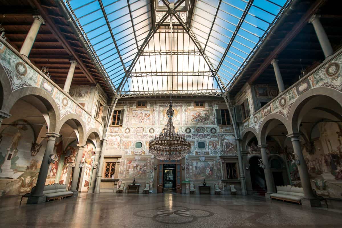 A nord invece si estende per numerosi ettari il parco romantico realizzato nell’Ottocento per volere di Leopoldo II di Lorena. In epoca sabauda, in occasione dei festeggiamenti per il fidanzamento tra il figlio del re, Emanuele di Mirafiori e Bianca di Larderel, il cortile fu trasformato in una sala da ballo con copertura in vetro e ferro e le logge, oggi visitabili ancora una volta.