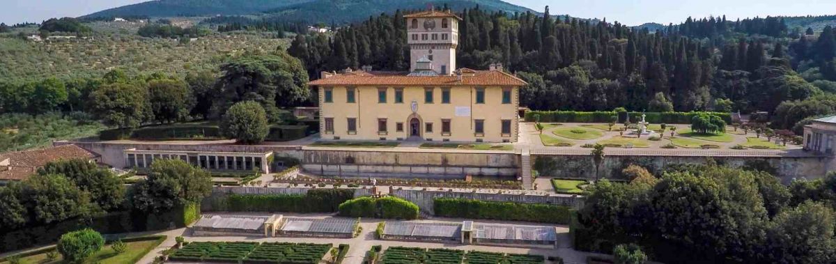 La Villa si erge con la sua inconfondibile torre in posizione dominante sulle pendici di Monte Morello degradanti verso la piana con splendida vista su Firenze.